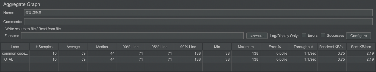 View Result Tree 를 통해 해당 HTTP Request 의 성공 여부 및 Response/Request Body, Resonse/Request Header 확인이, Aggregate Graph 에서는 아래 사진과 같이 응답시간, 에러% 등 확인이가능하다.