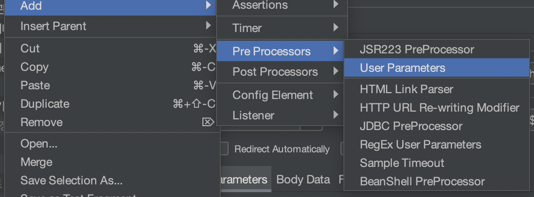 해당 Sampler 에서 Add > Pre Processcor > User Parameters 추가 후 Parameters 를 생성하자 (아래 사진 참고)