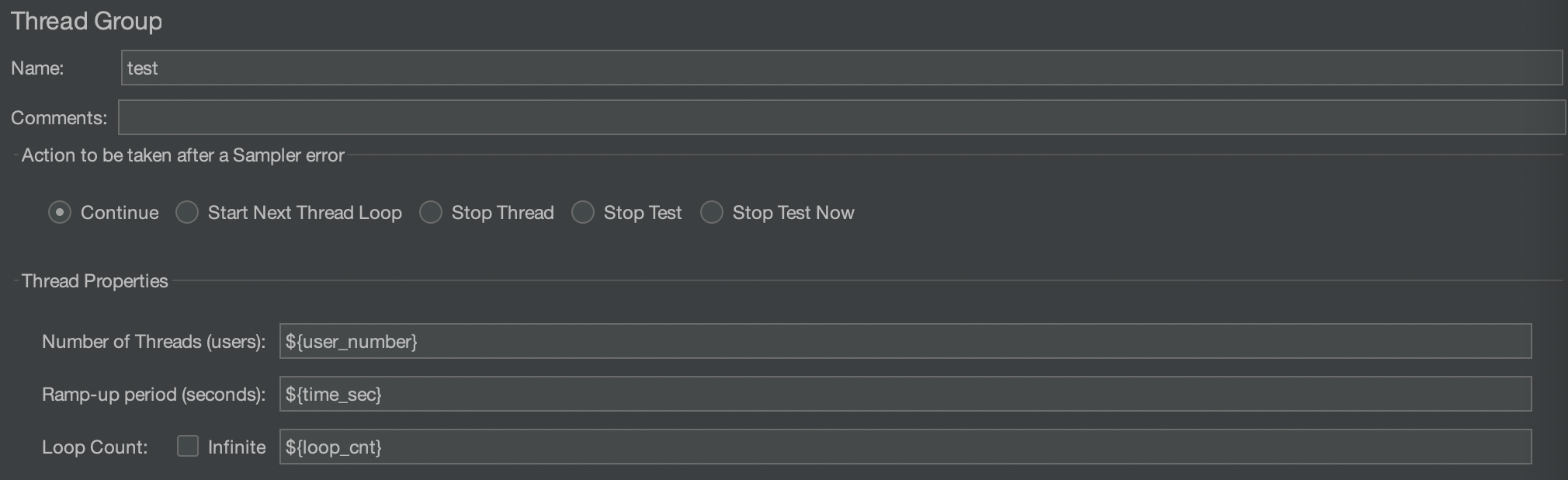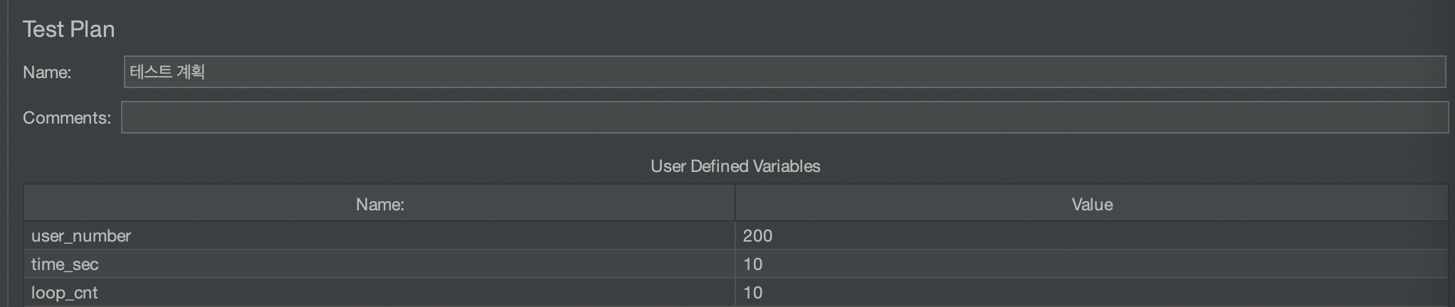 Test Plan에서 user_number, time_sec, loop_cnt 를 정의하고